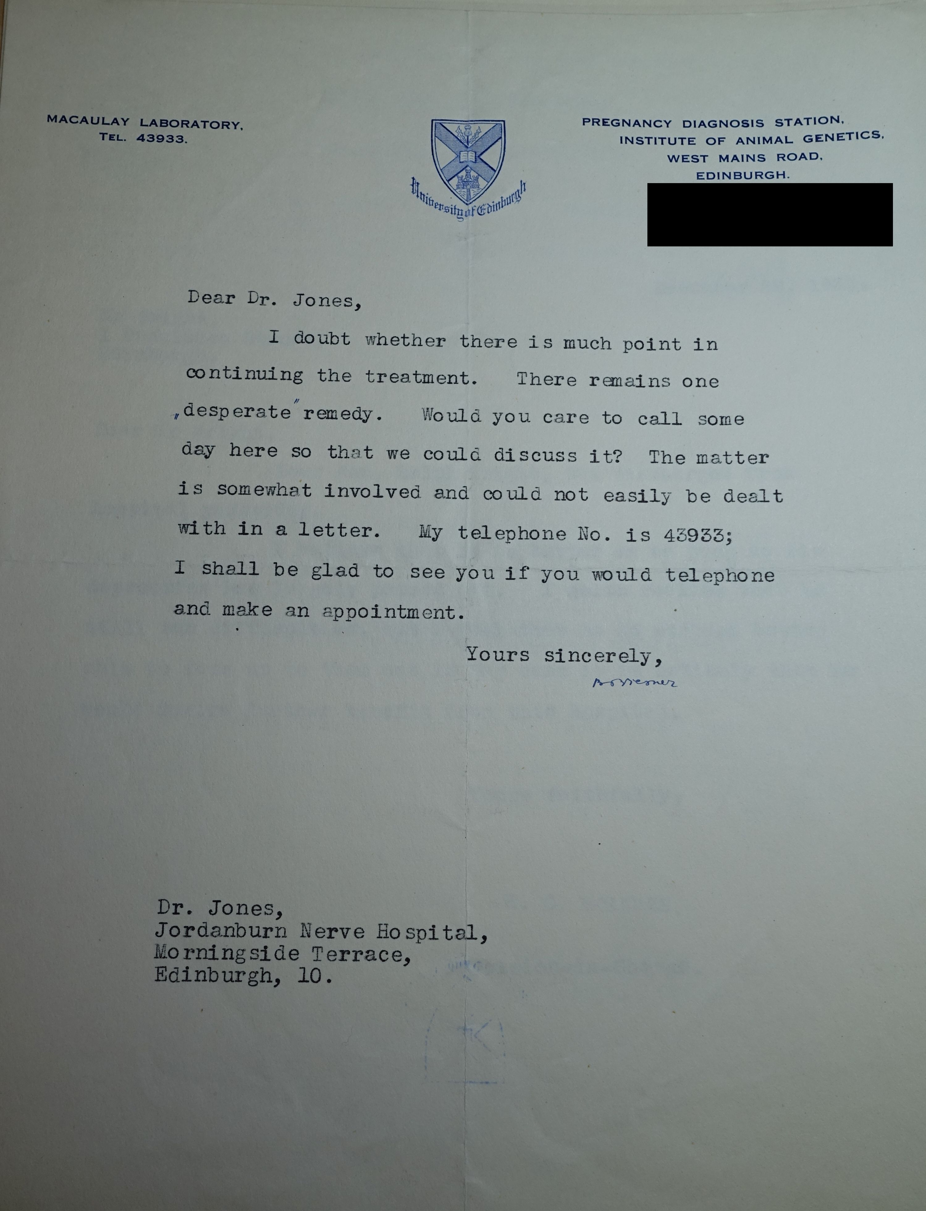 Wiesner writes back to say that there would be no benefit in continuing the treatment and states that ‘there remains one desperate remedy’ which he asks to discuss with Dr Jones on the phone as it is ‘rather involved’.